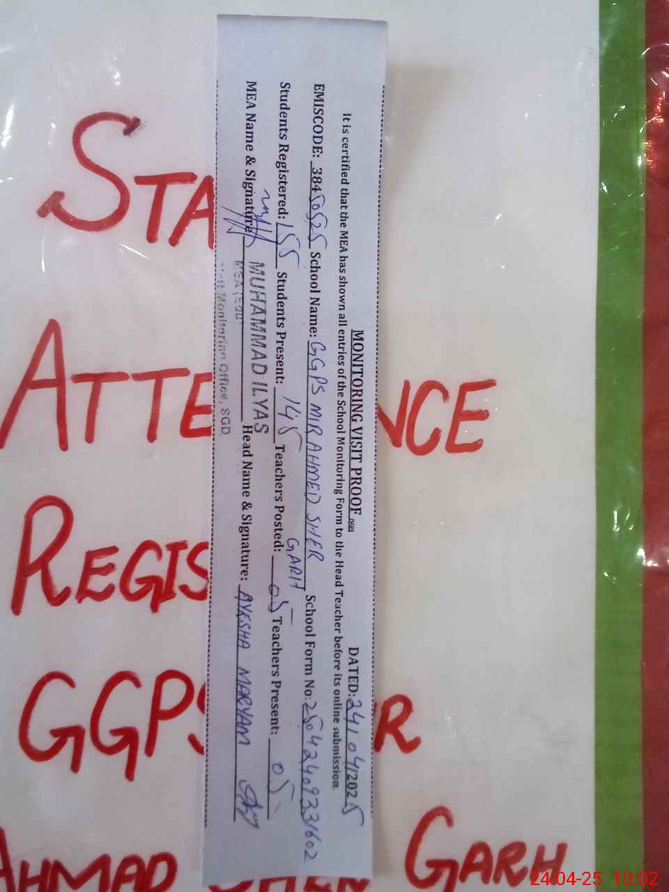 | Attendance Register | Head Teacher | MEA with School | Visit Proof |