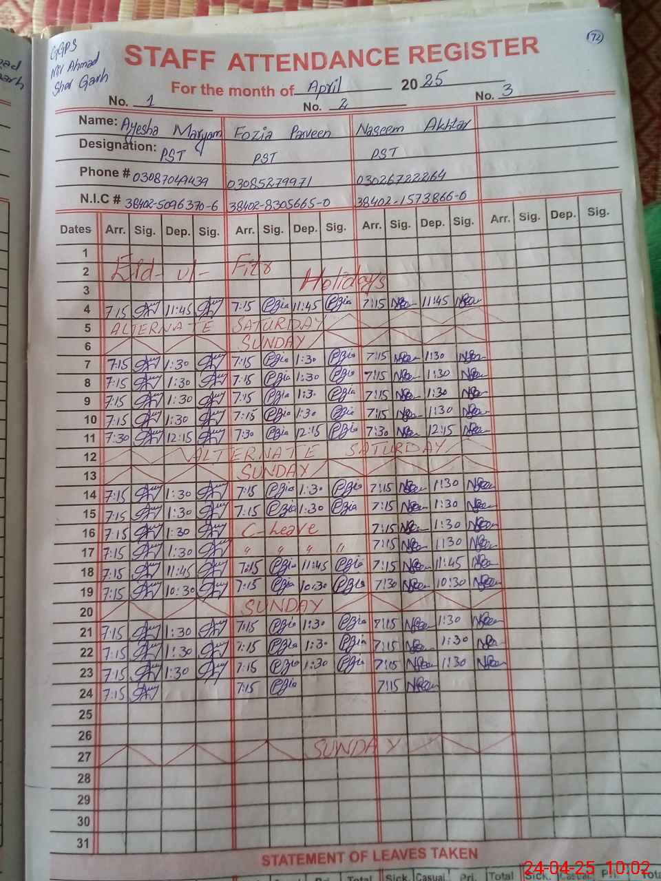 | CNIC | Full Name | Designation | R/C | Absence During Last Calender Month |