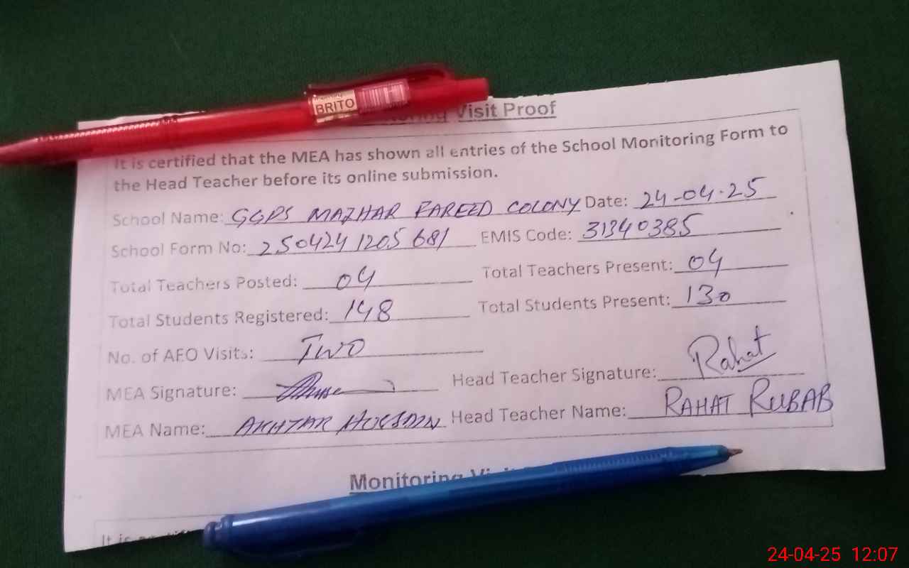 | Attendance Register | Head Teacher | MEA with School | Visit Proof |