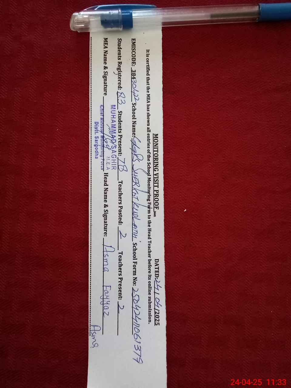 | Attendance Register | Head Teacher | MEA with School | Visit Proof |