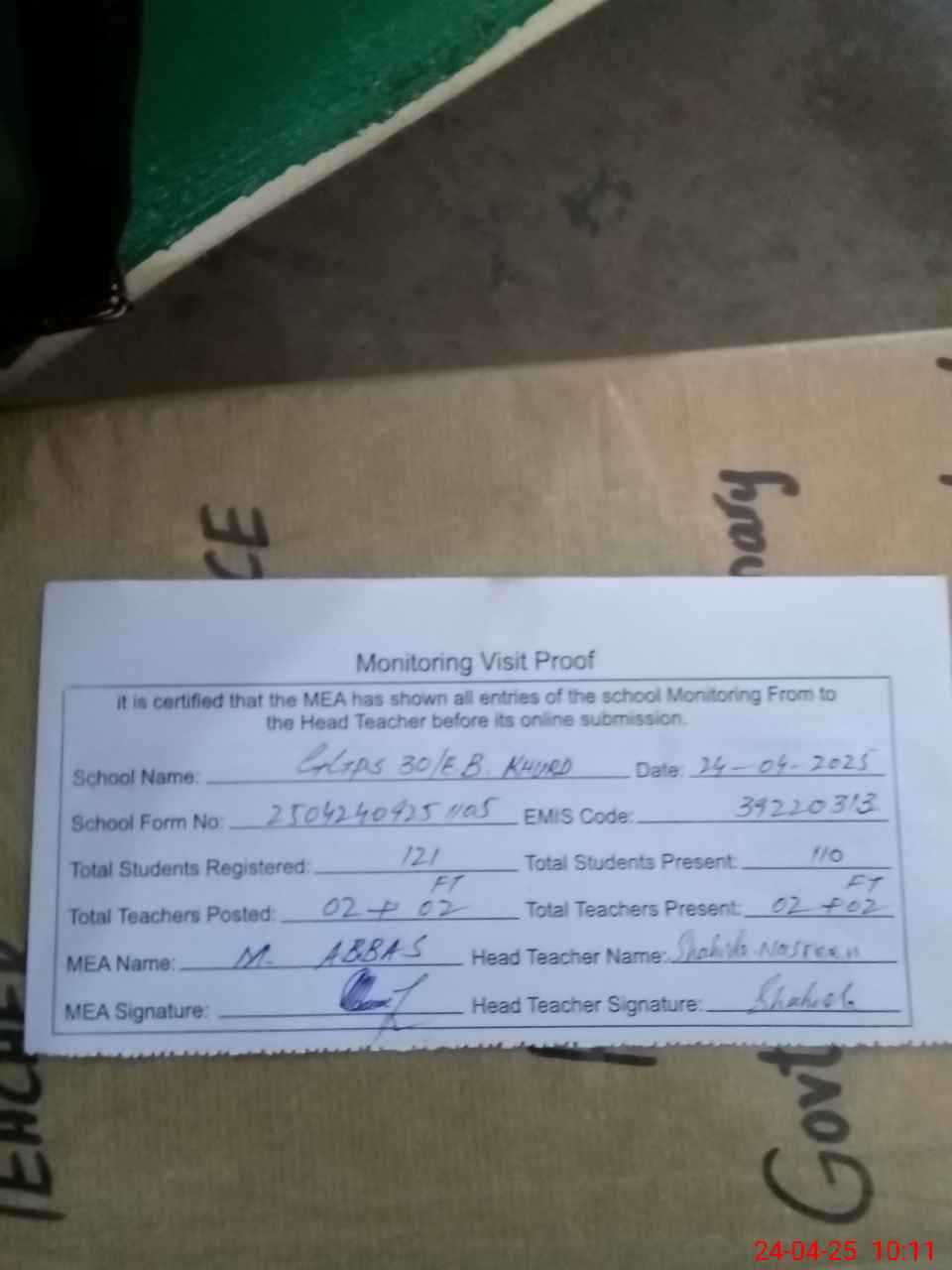 | Attendance Register | Head Teacher | MEA with School | Visit Proof |