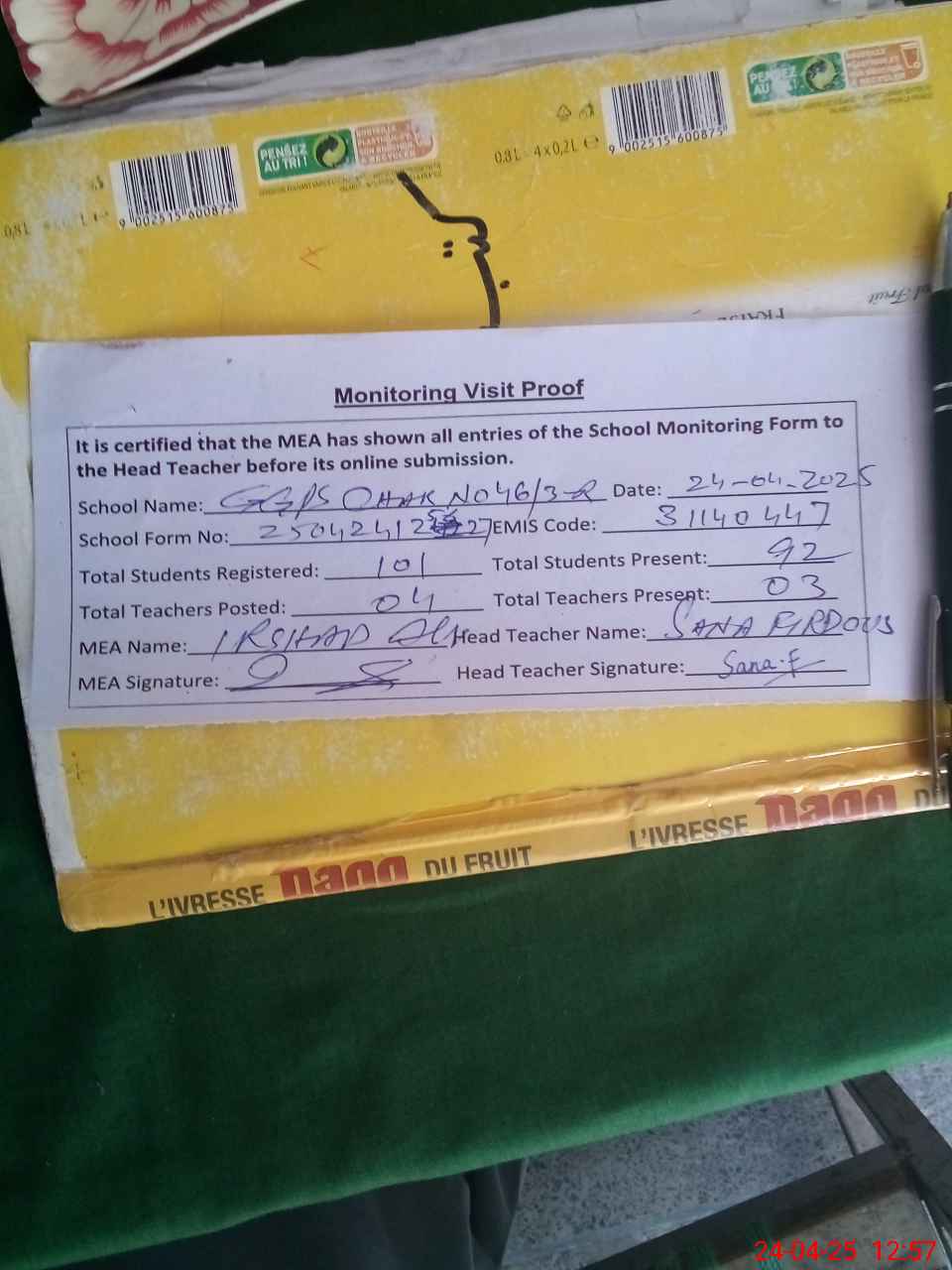 | Attendance Register | Head Teacher | MEA with School | Visit Proof |
