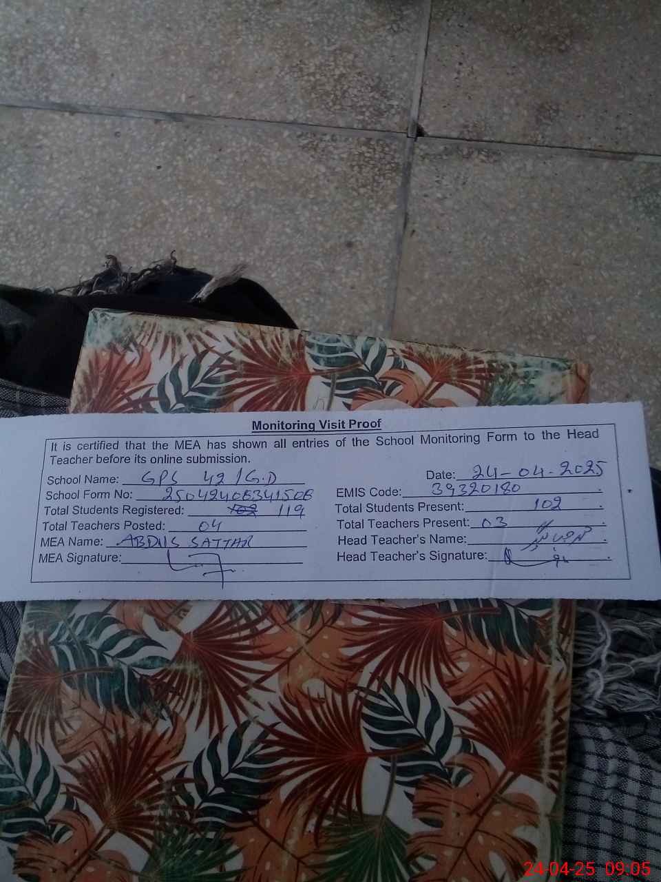 | Attendance Register | Head Teacher | MEA with School | Visit Proof |