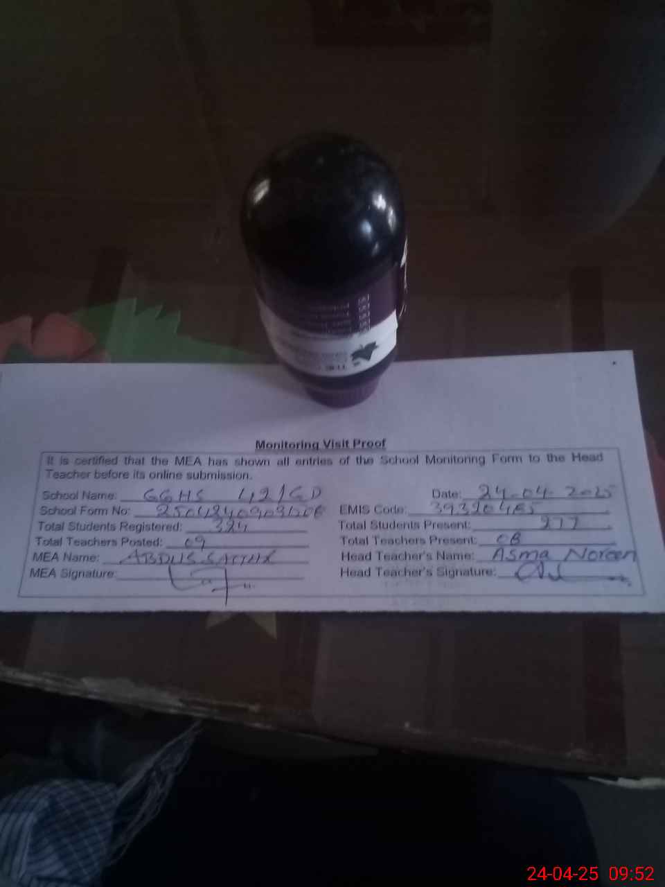 | Attendance Register | Head Teacher | MEA with School | Visit Proof |