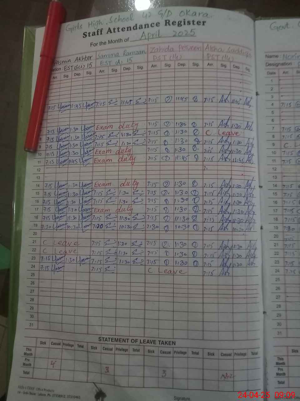 | Leave | Duty | Absent | Maternity | Medical | Ex- Pak |