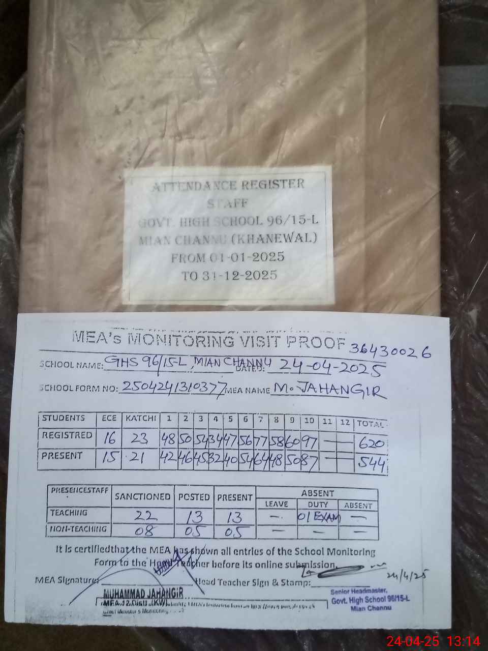 | Attendance Register | Head Teacher | MEA with School | Visit Proof |