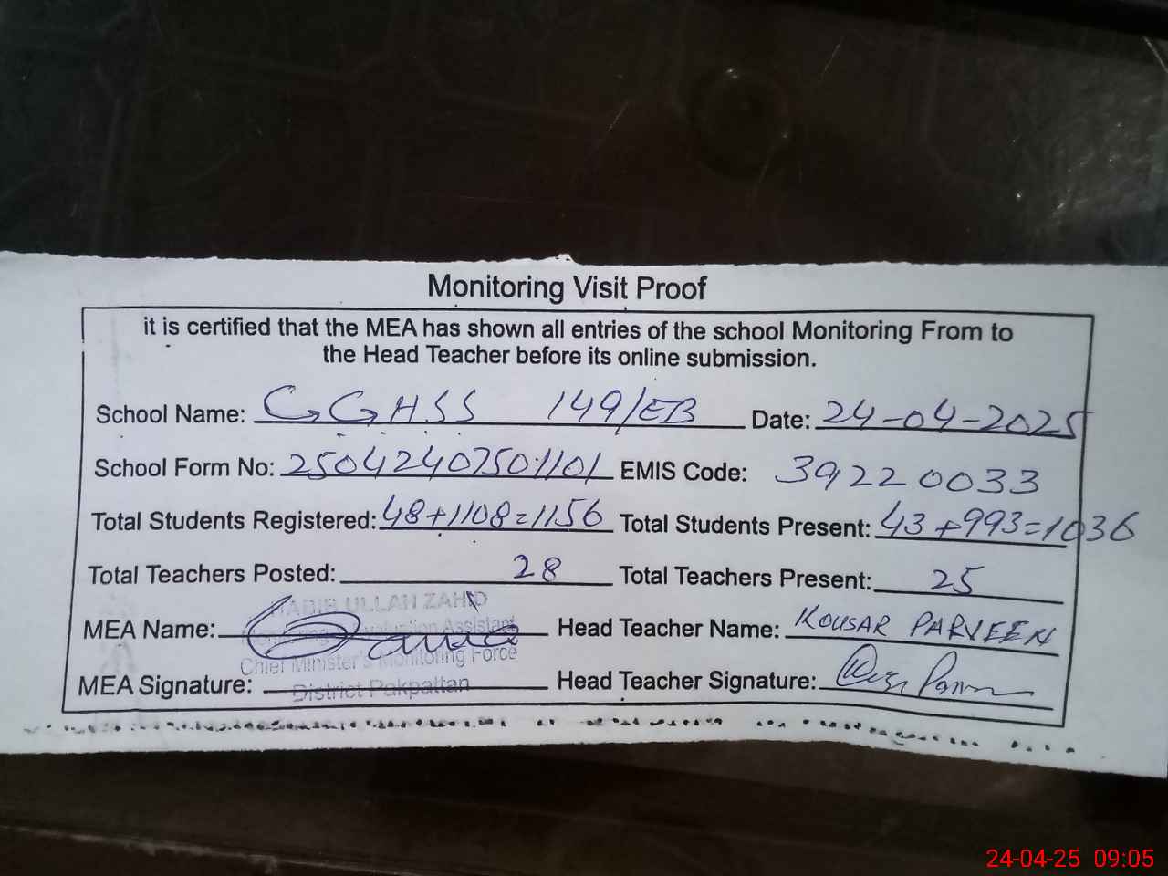 | EMIS Code: 39220033 | Name of School: GGHSS 149 EB ARIFWALA | |||