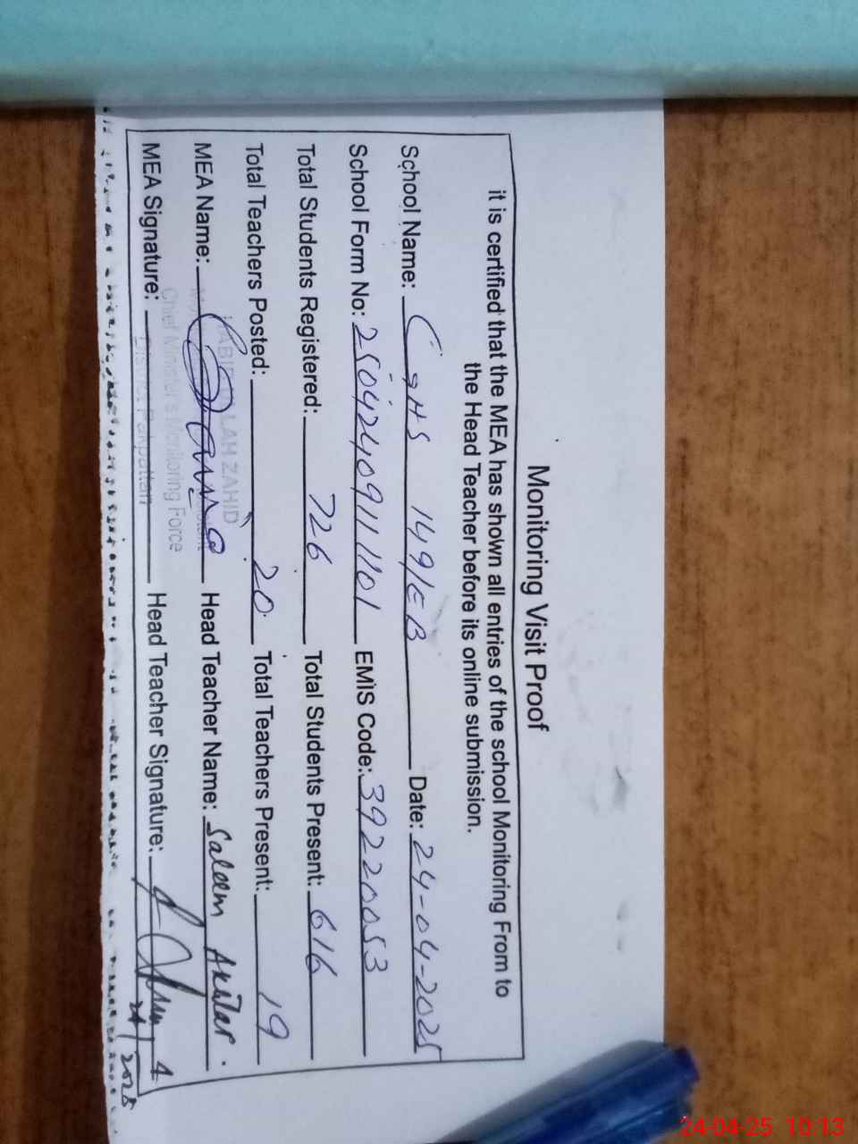 | Remarks (Use Separate Page if Required): Note STI JAMIL AHMED SST HEALTH SCI CNIC 3640110248551 FOUND PRESENT AT TIME OF SCHOOL NSPECTION | |||||
