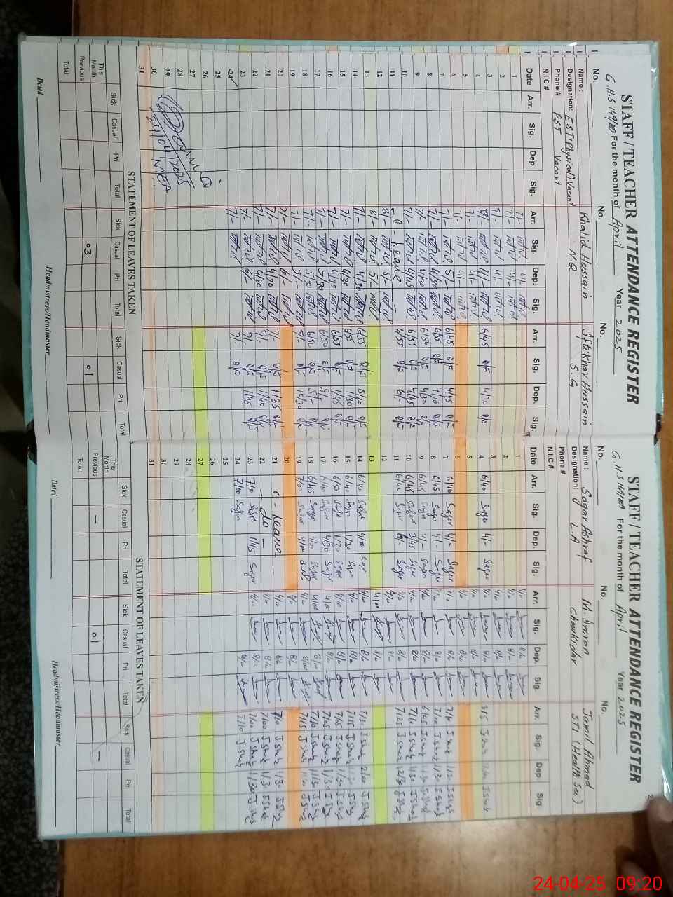 | CNIC | Full Name | Designation | R/C | Absence During Last Calender Month |