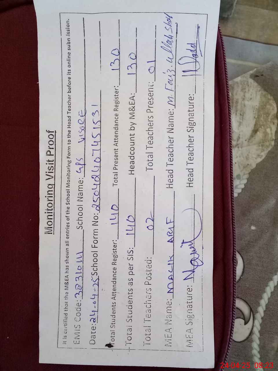 | Attendance Register | Head Teacher | MEA with School | Visit Proof |