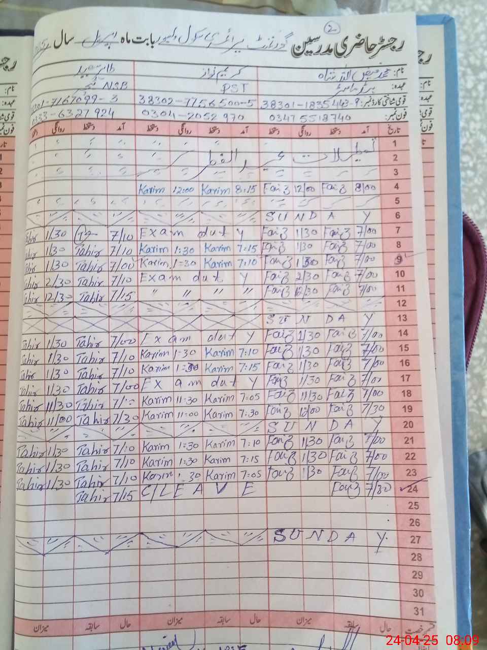 | CNIC | Full Name | Designation | R/C | Absence During Last Calender Month |