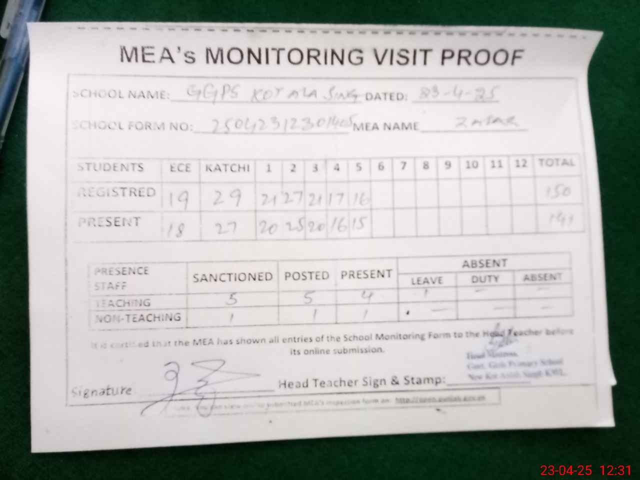 | Attendance Register | Head Teacher | MEA with School | Visit Proof |