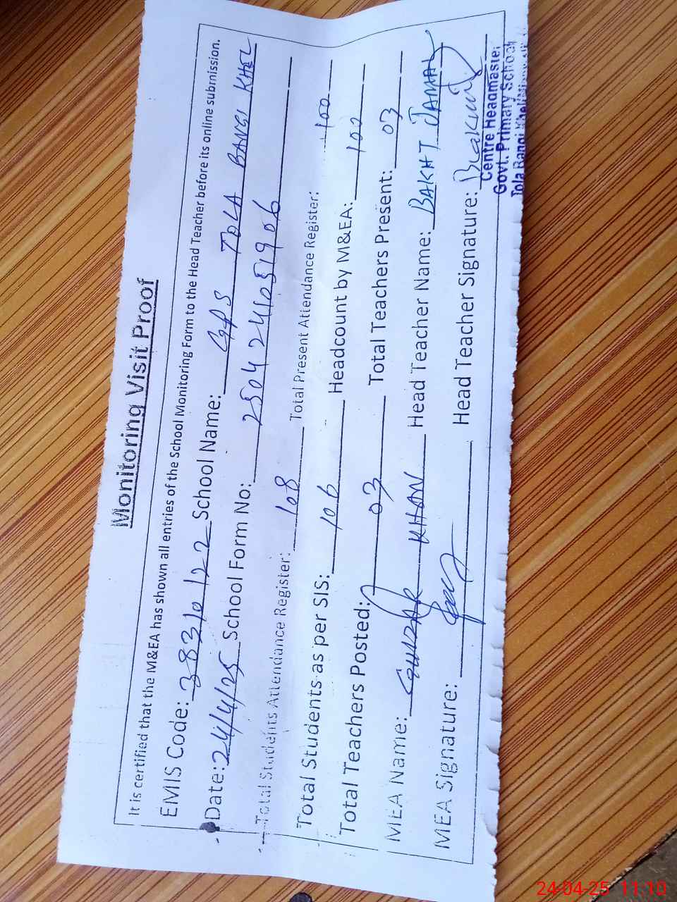 | Attendance Register | Head Teacher | MEA with School | Visit Proof |