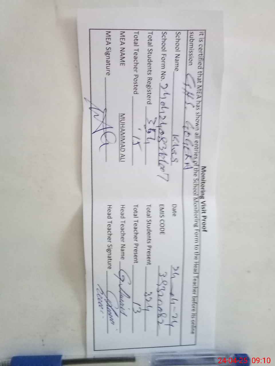 | Attendance Register | Head Teacher | MEA with School | Visit Proof |