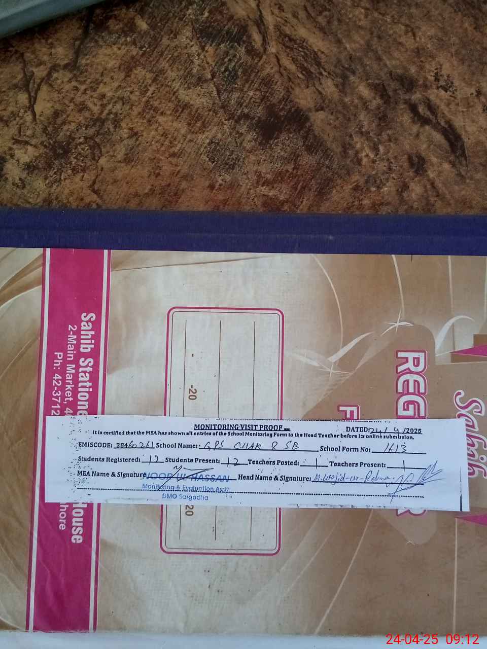 | Attendance Register | Head Teacher | MEA with School | Visit Proof |