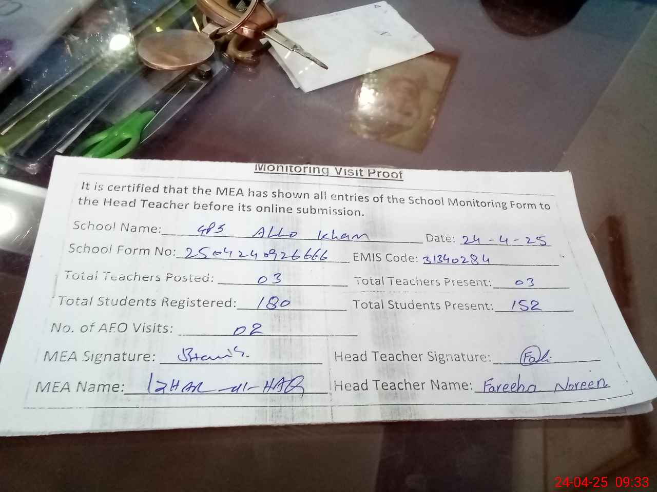| Attendance Register | Head Teacher | MEA with School | Visit Proof |
