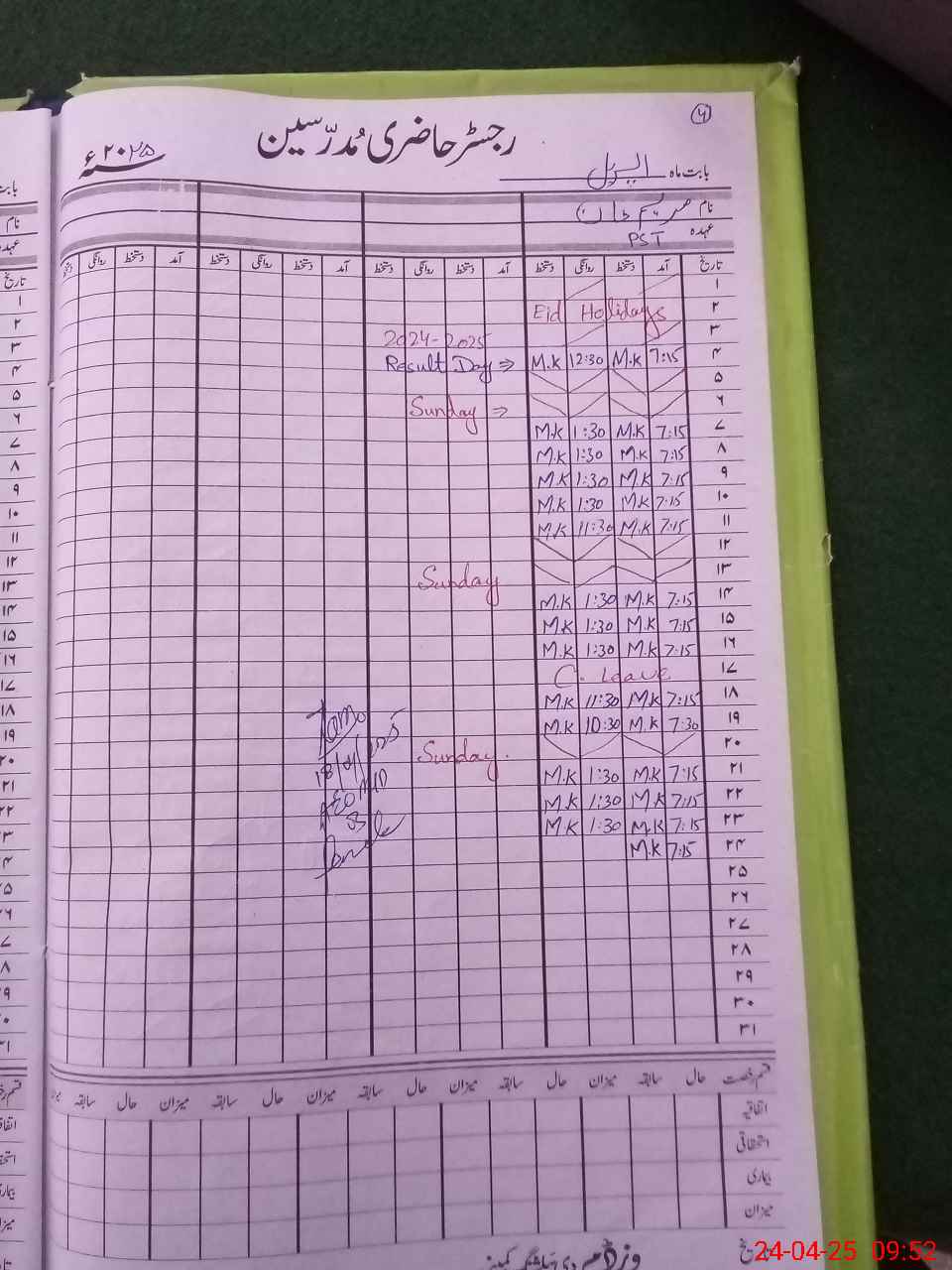 | CNIC | Full Name | Designation | R/C | Absence During Last Calender Month |