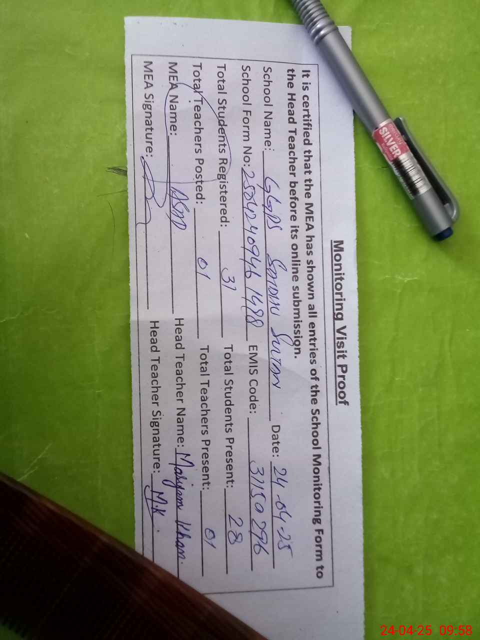 | Attendance Register | Head Teacher | MEA with School | Visit Proof |
