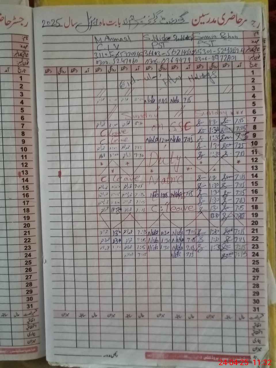 | CNIC | Full Name | Designation | R/C | Absence During Last Calender Month |