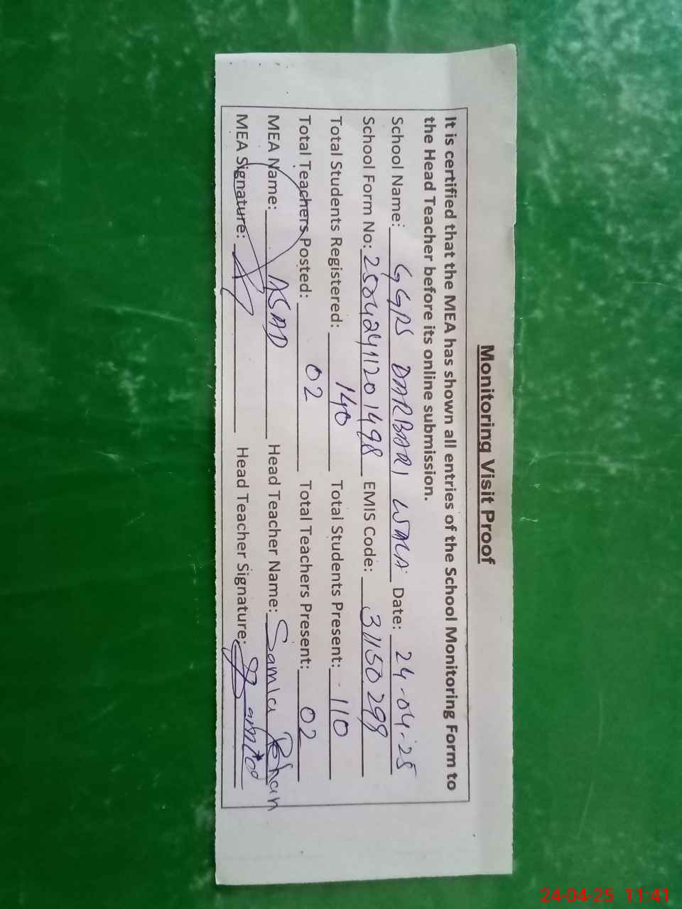 | Attendance Register | Head Teacher | MEA with School | Visit Proof |