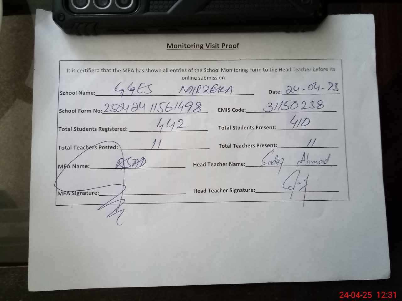 | Attendance Register | Head Teacher | MEA with School | Visit Proof |