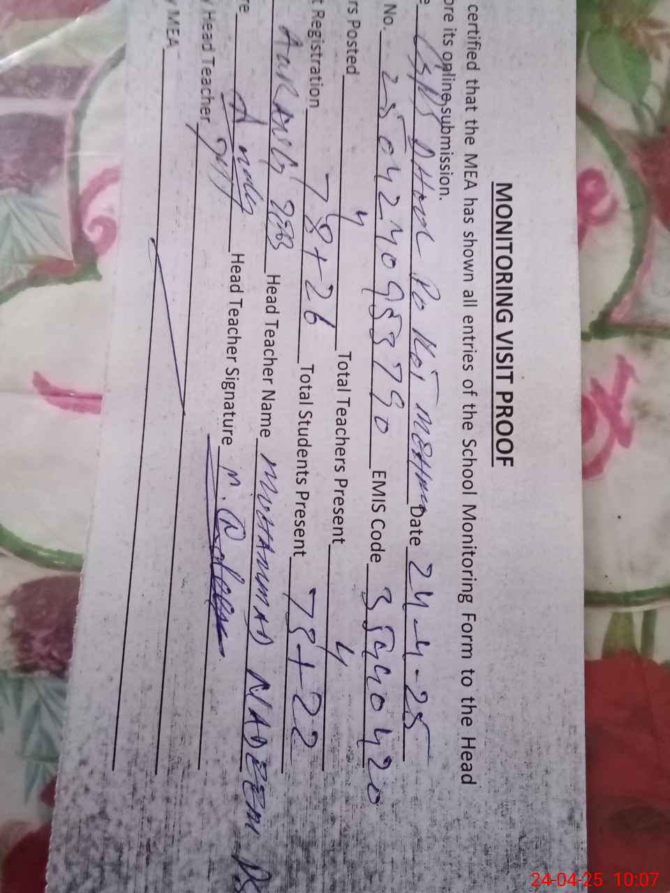 | Attendance Register | Head Teacher | MEA with School | Visit Proof |