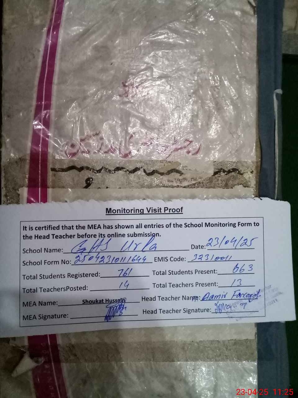 | Attendance Register | Head Teacher | MEA with School | Visit Proof |