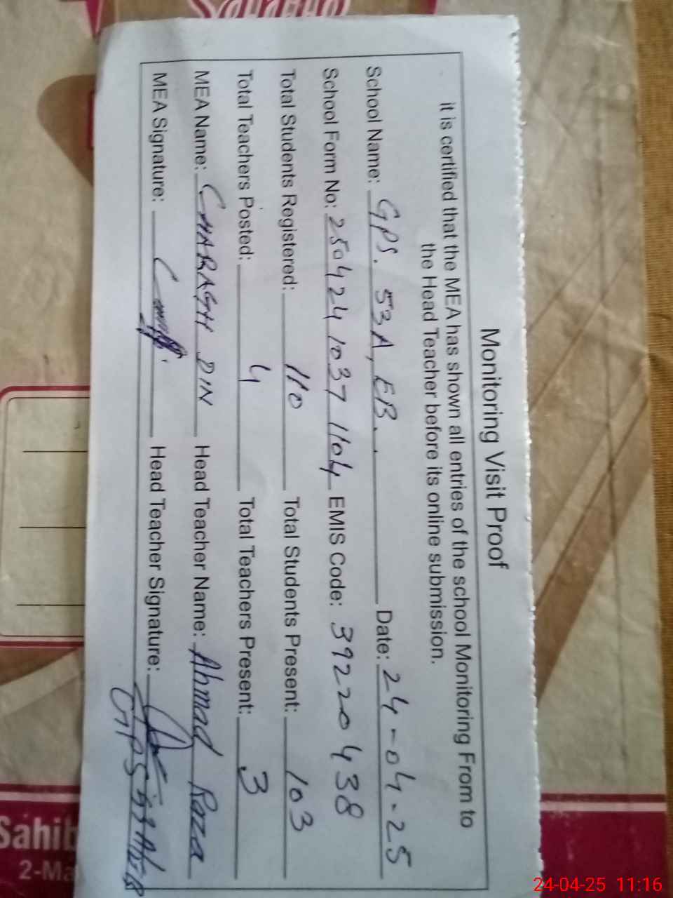 | EMIS Code: 39220438 | Name of School: GPS CHAK NO. 53 EB A | |||