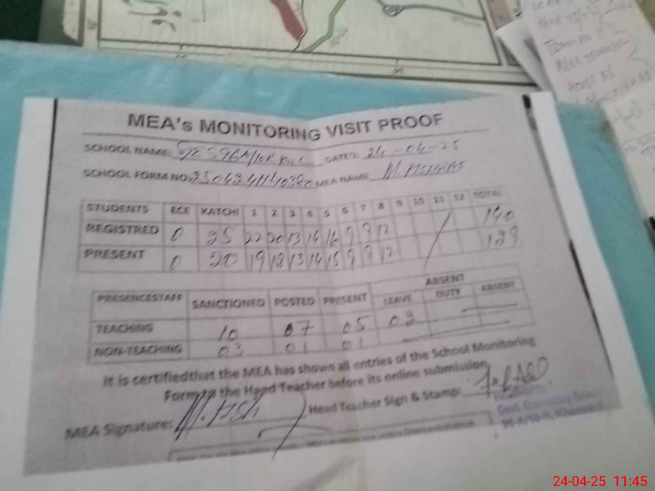 | Attendance Register | Head Teacher | MEA with School | Visit Proof |