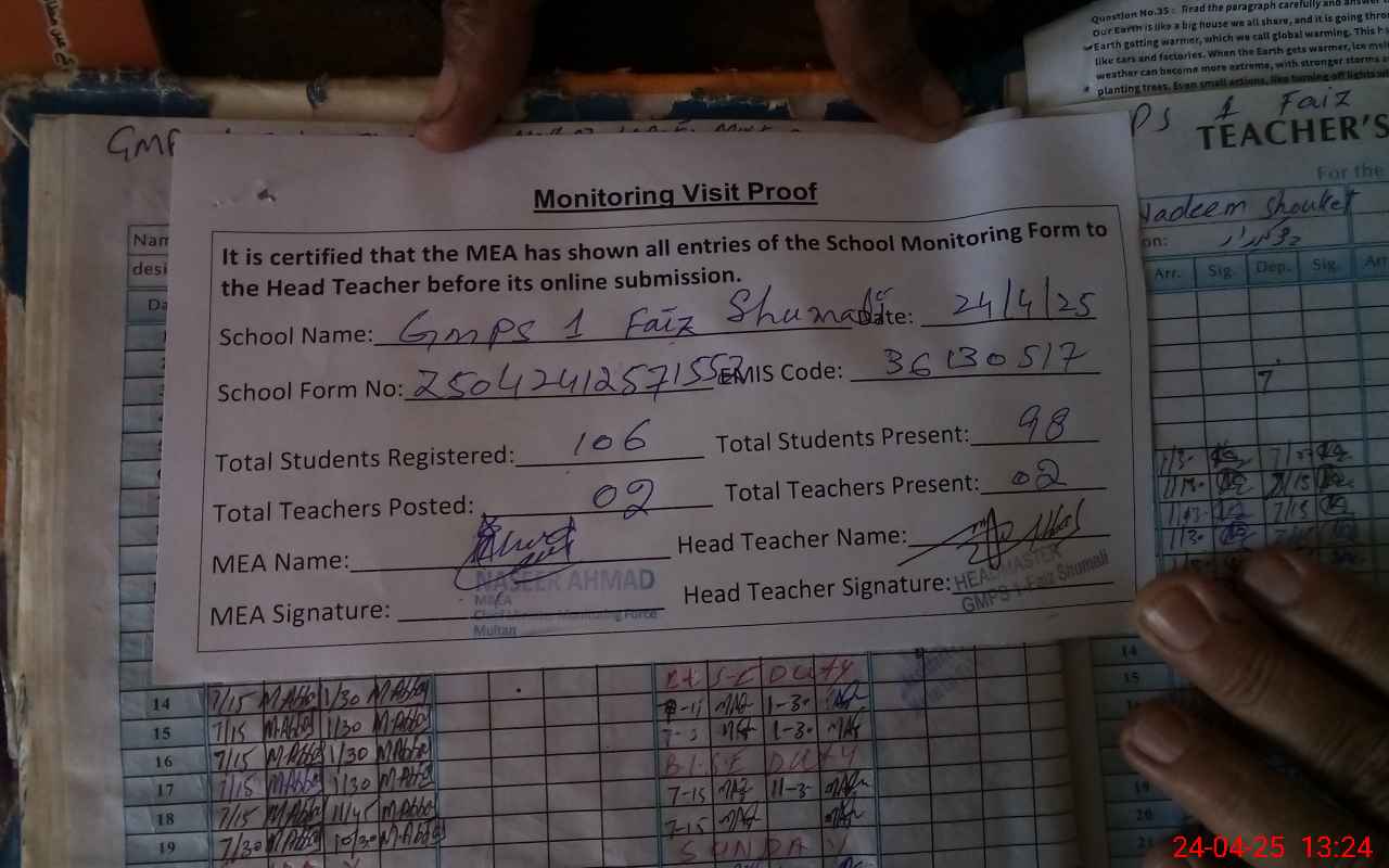 | Attendance Register | Head Teacher | MEA with School | Visit Proof |