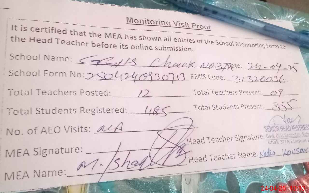 | Attendance Register | Head Teacher | MEA with School | Visit Proof |