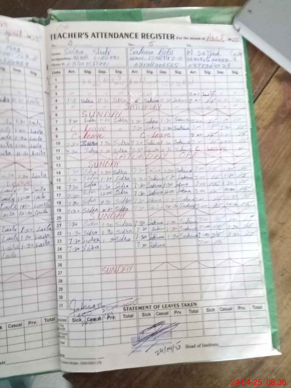 | Name: ZA**** ZA**** Designation: (School Headmaster's/Headmistress's) INCHARGE Phone/Cell Number: 03**** |