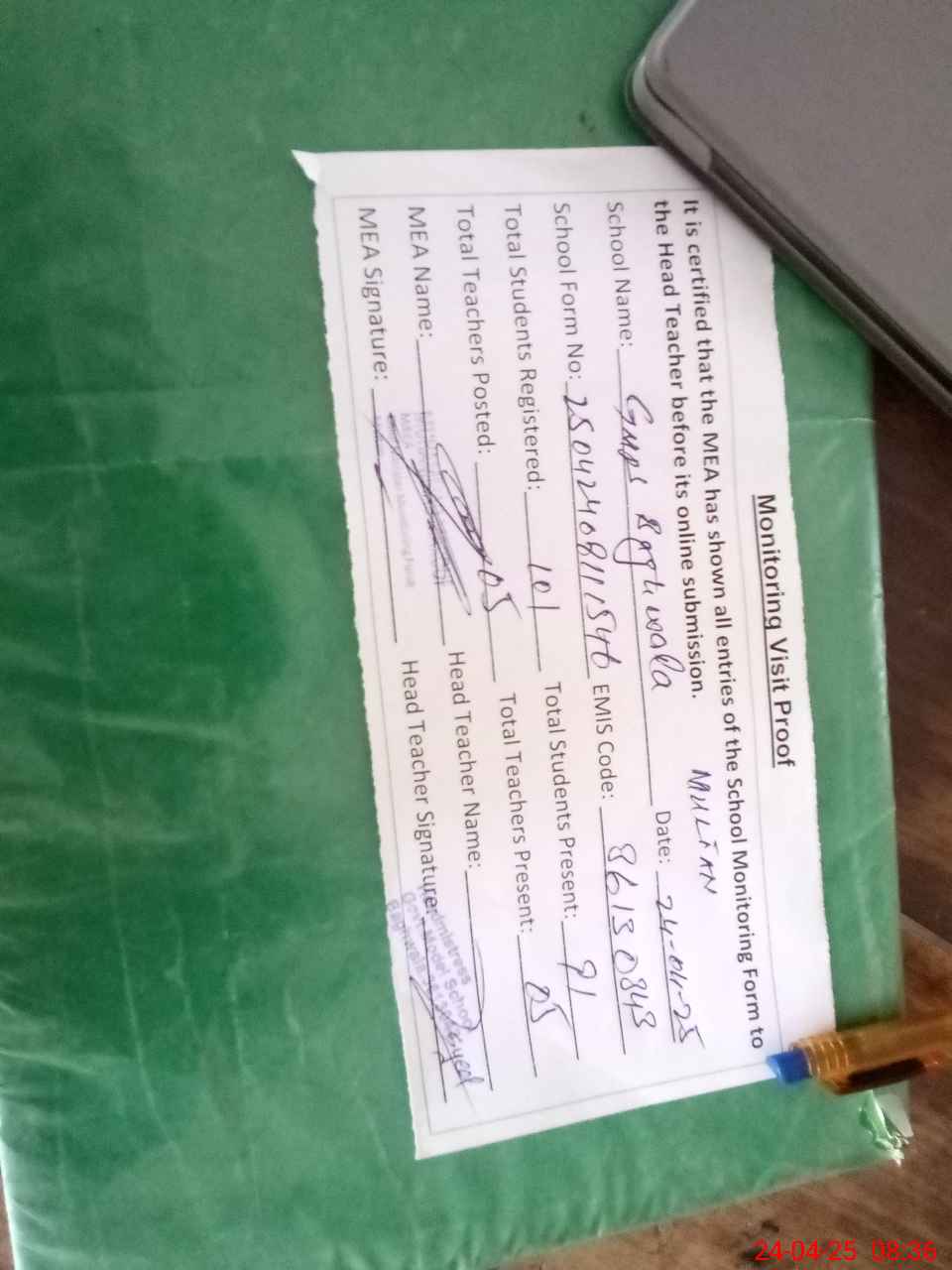 | Attendance Register | Head Teacher | MEA with School | Visit Proof |