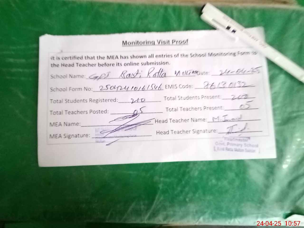 | Attendance Register | Head Teacher | MEA with School | Visit Proof |