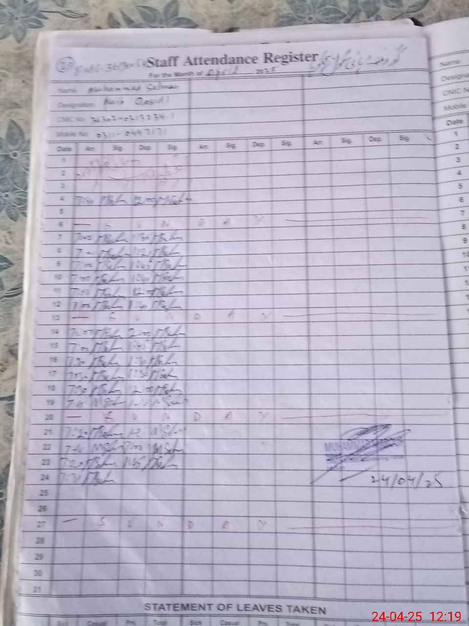 | CNIC | Full Name | Designation | R/C | Absence During Last Calender Month |