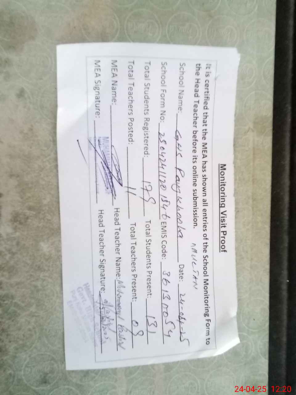 | Attendance Register | Head Teacher | MEA with School | Visit Proof |
