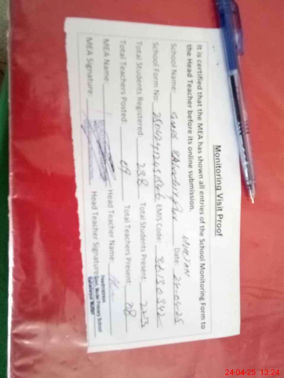 | Attendance Register | Head Teacher | MEA with School | Visit Proof |