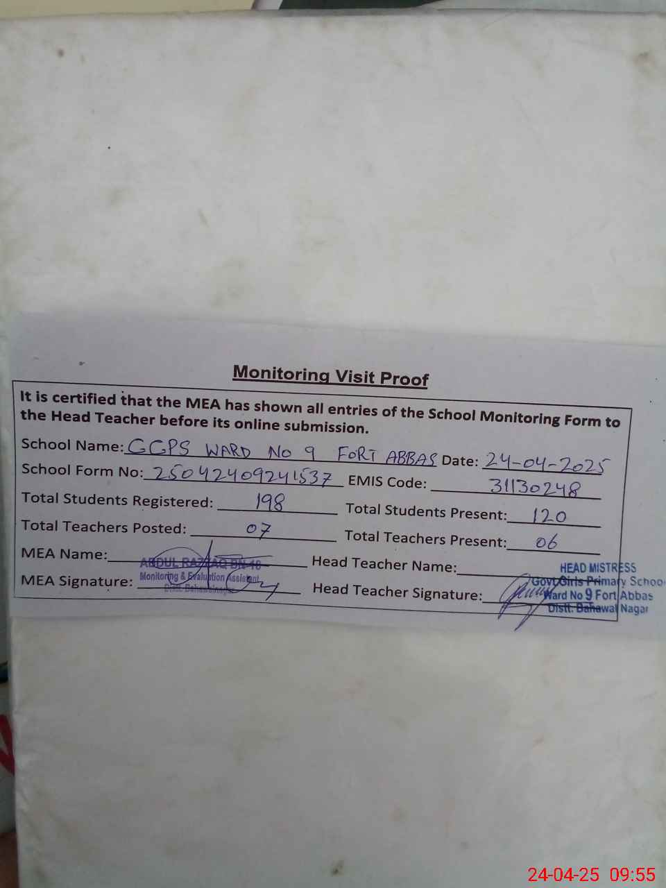 | EMIS Code: 31130248 | Name of School: GGPS WARD NO. 9 FORT ABBAS | |||