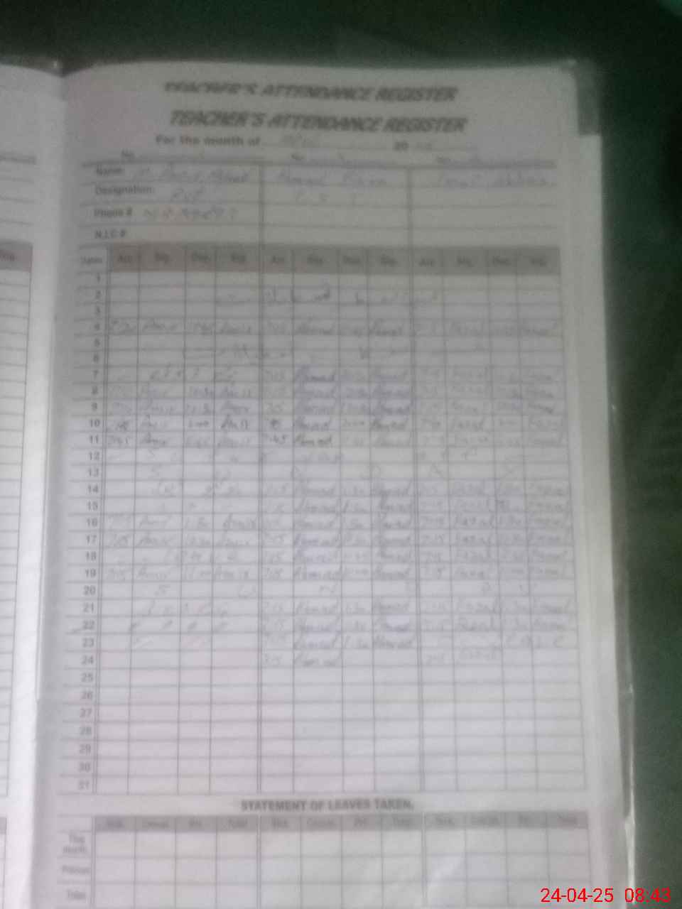 | CNIC | Full Name | Designation | R/C | Absence During Last Calender Month |