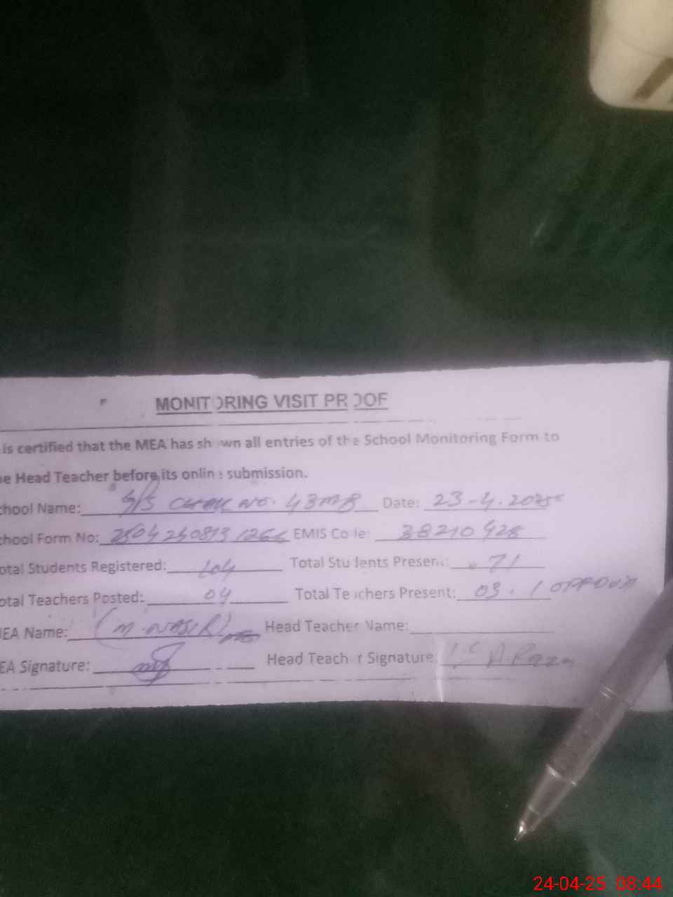 | Attendance Register | Head Teacher | MEA with School | Visit Proof |