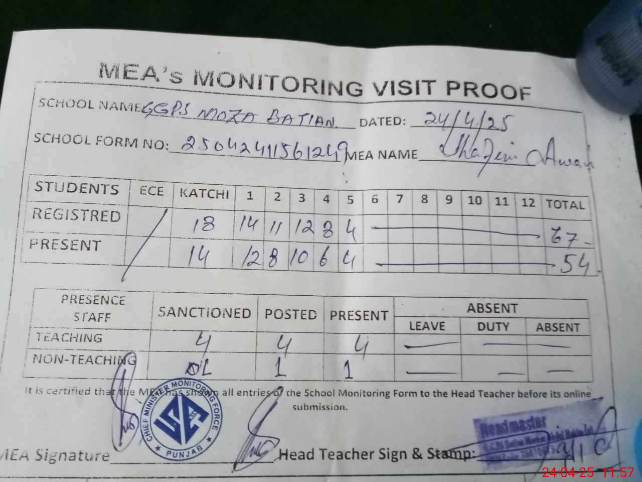 | EMIS Code: 36410475 | Name of School: GGPS MOUZA BAATIAN, ABDUL HAKIM | |||
