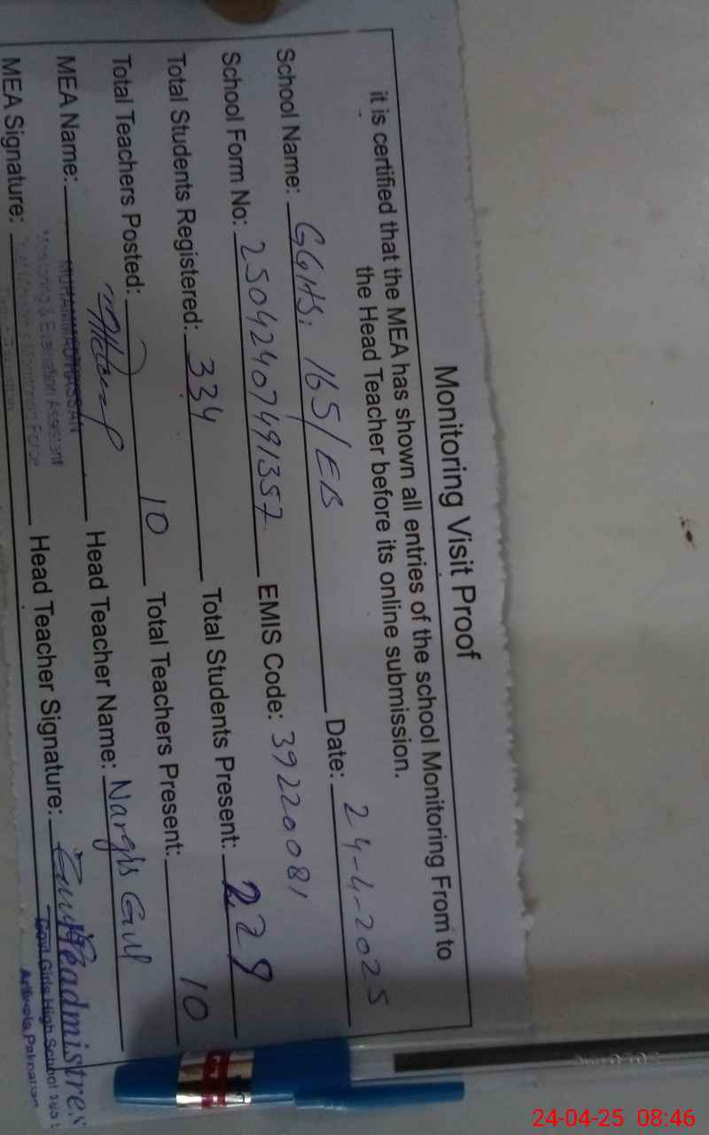 | EMIS Code: 39220081 | Name of School: GGHS 165 EB P/O 163 EB | |||
