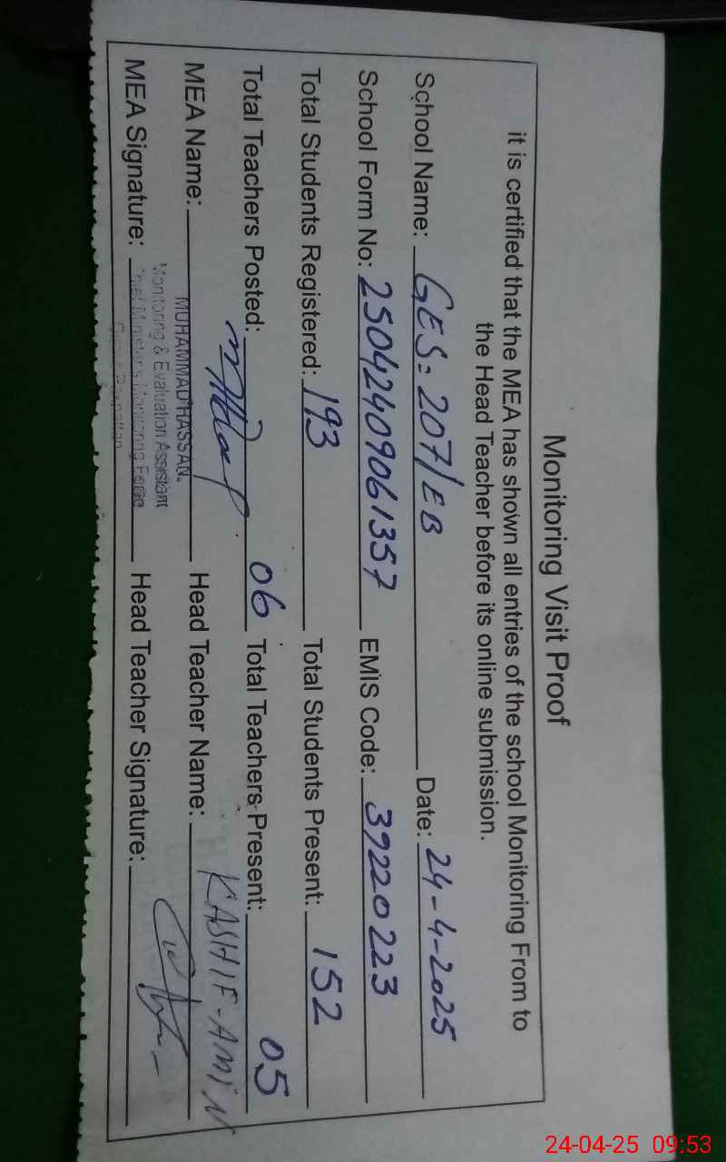 | EMIS Code: 39220223 | Name of School: GES CHAK NO. 207 EB P.O SAME ARIF WALA | |||