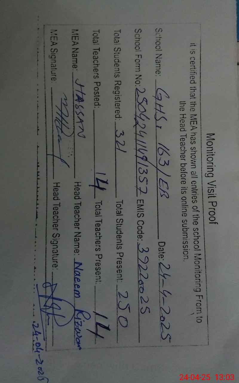 | EMIS Code: 39220025 | Name of School: GHS 163/EB | |||