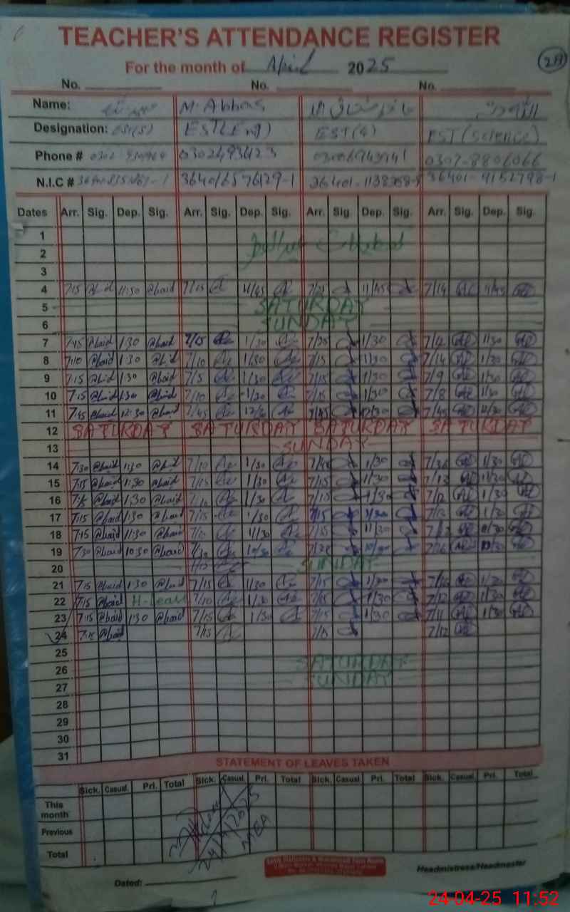 | CNIC | Full Name | Designation | R/C | Absence During Last Calender Month |