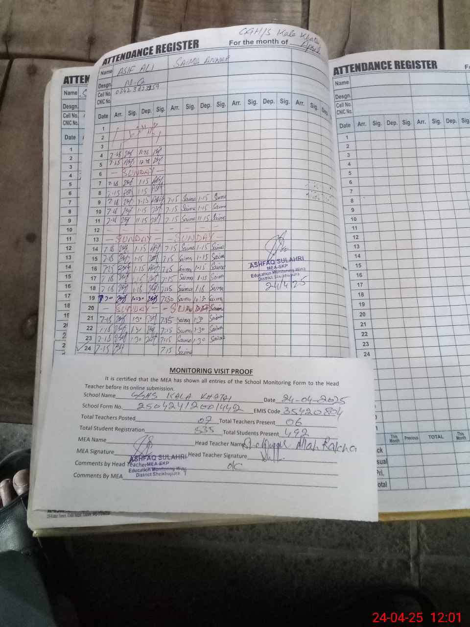 | Attendance Register | Head Teacher | MEA with School | Visit Proof |