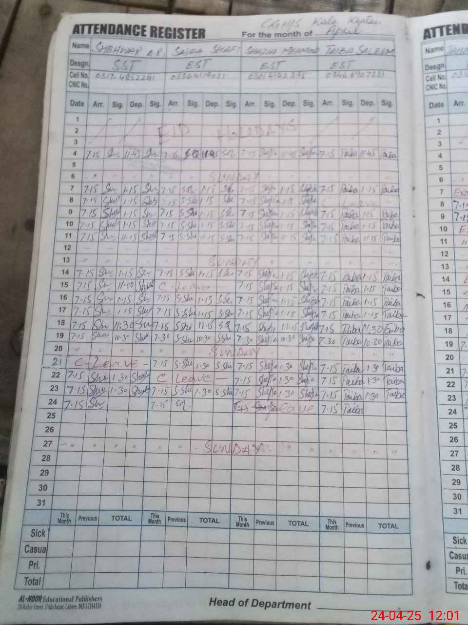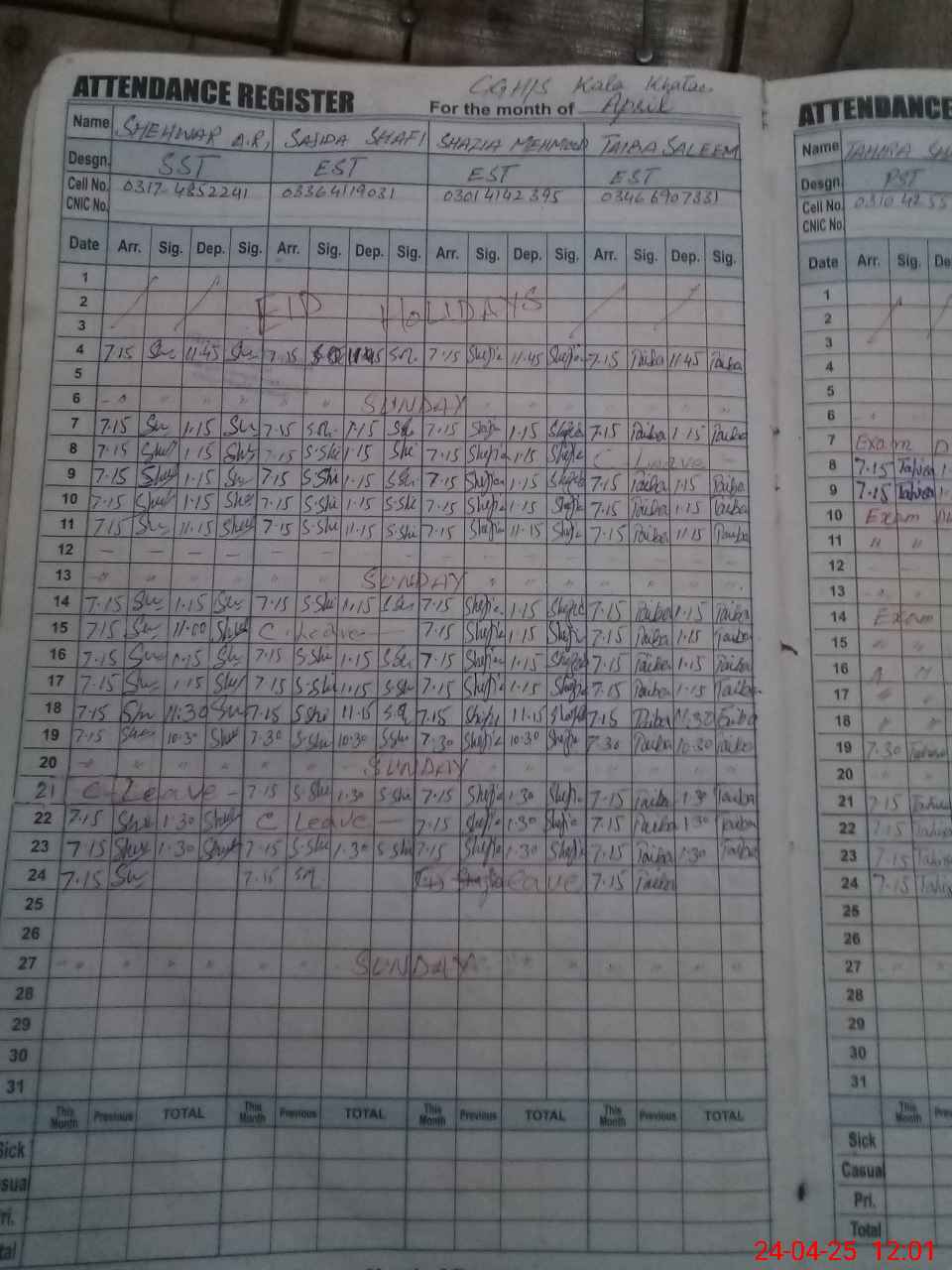 | CNIC | Full Name | Designation | R/C | Absence During Last Calender Month |