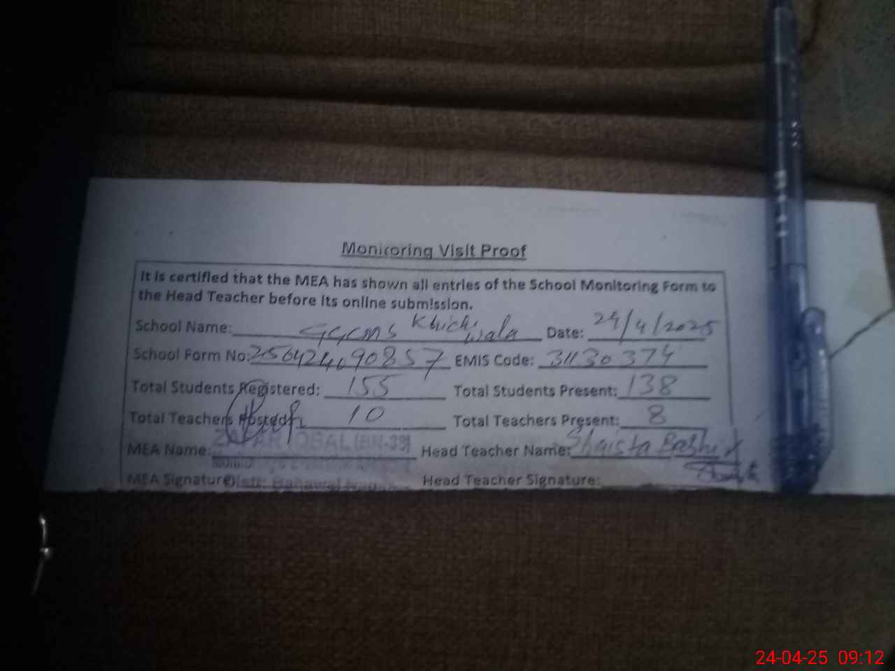 | EMIS Code: 31130374 | Name of School: GGCMS KHICHIWALA | |||