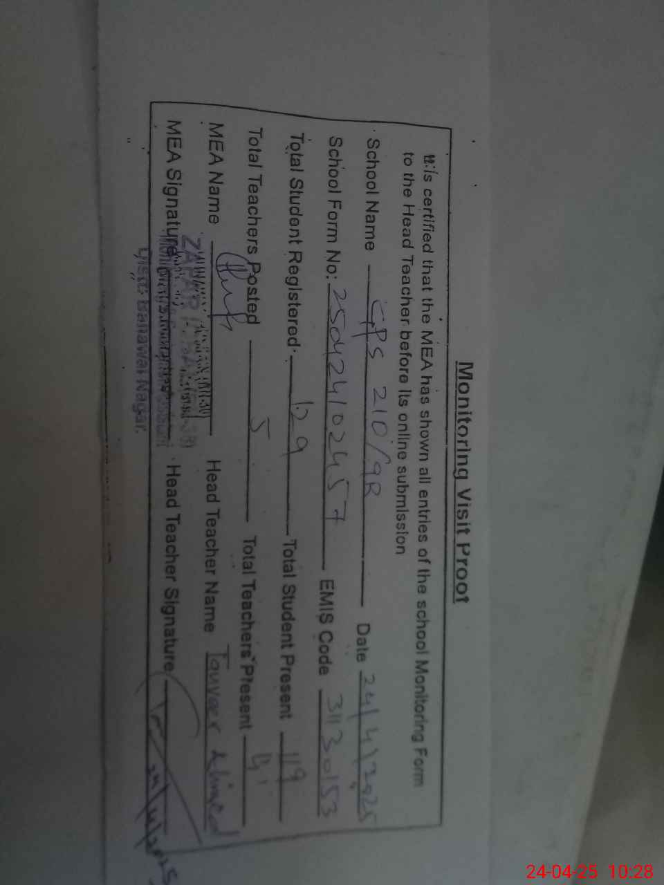 | Attendance Register | Head Teacher | MEA with School | Visit Proof |