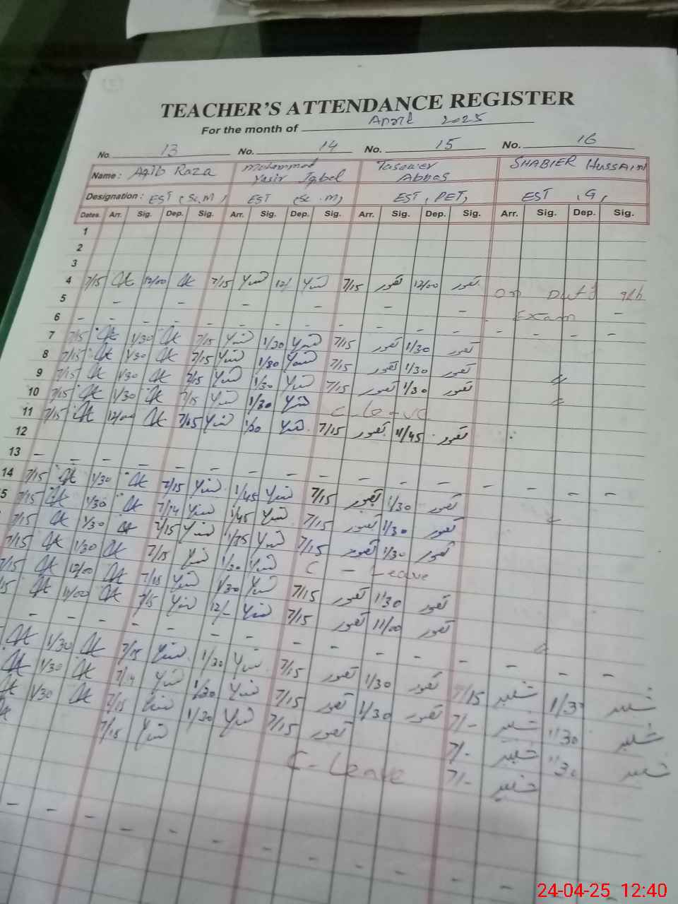 | CNIC | Full Name | Designation | R/C | Absence During Last Calender Month |